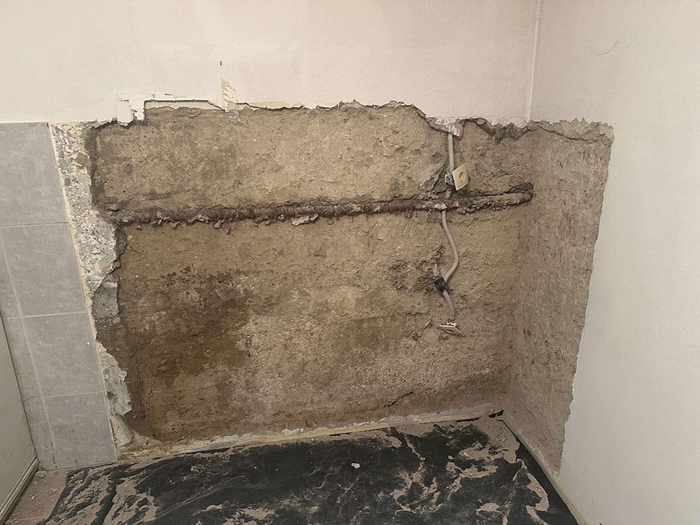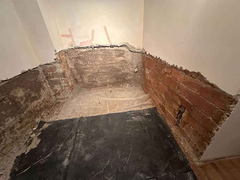 ✔ Nach dem Entfernen der beschädigten Schichten wird die Wand gründlich gereinigt, um eine optimale Haftung des Spezialentfeuchtungsputzes zu ermöglichen.