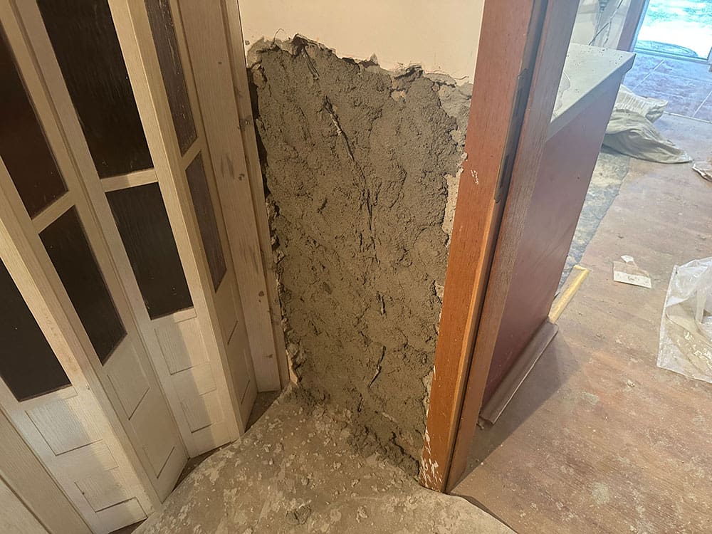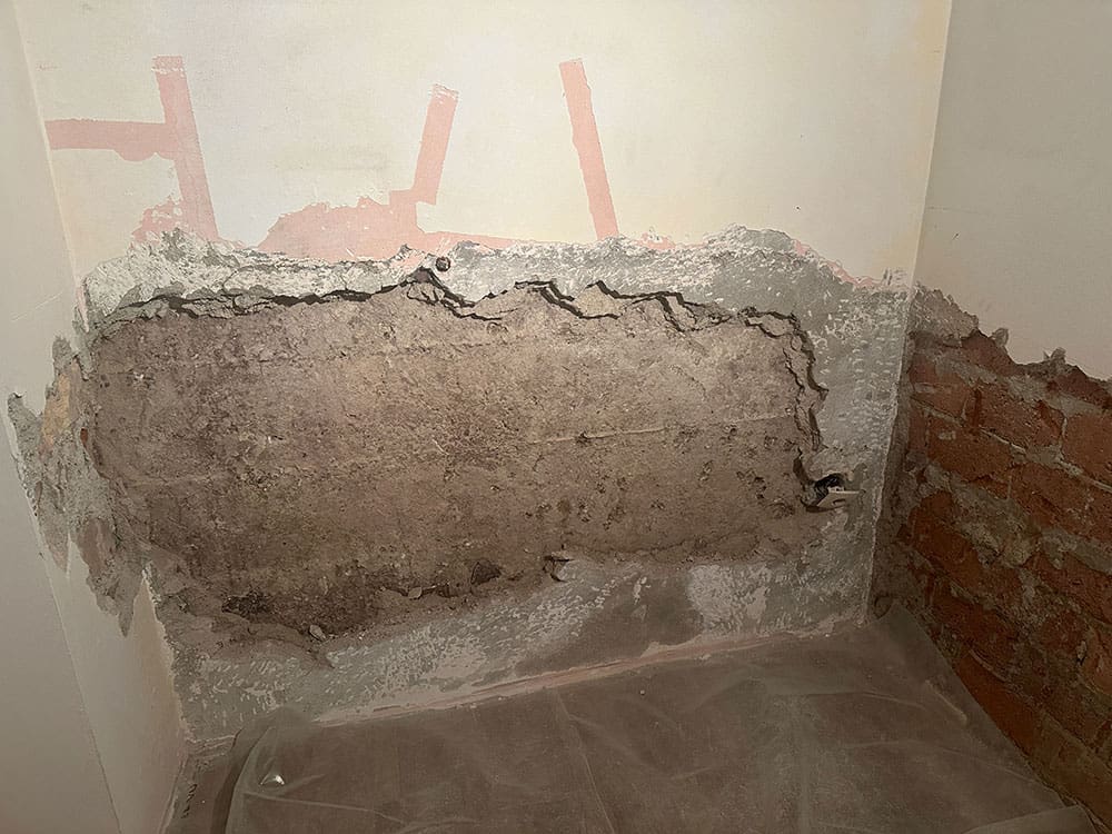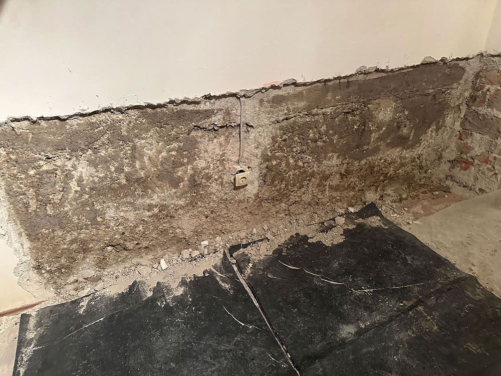Entfernen von beschädigtem Putz – Der erste Schritt bestand darin, die vorhandenen Putzschichten zu entfernen, die an einigen Stellen eine Dicke von bis zu 8 cm erreichten.